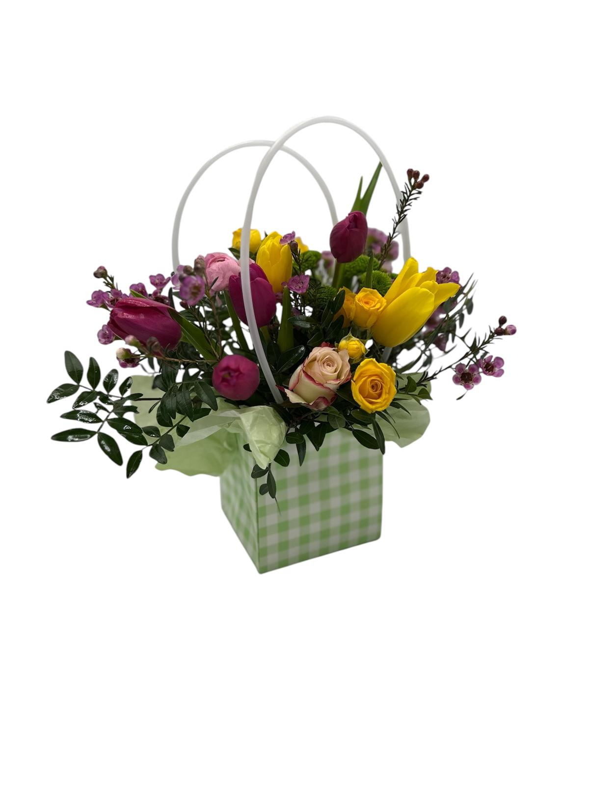 Aranjament floral elegant și rafinat aduce o explozie de culoare și prospețime în orice încăpere. Realizat cu grijă și atenție la detalii, buchetul combină frumusețea lalelelor galbene și mov cu delicatețea trandafirilor albi, creând un contrast fermecător. Mini trandafirii galbeni adaugă un plus de volum și textură, în timp ce florile de wax completează aranjamentul cu aspectul lor subtil și parfumul discret.