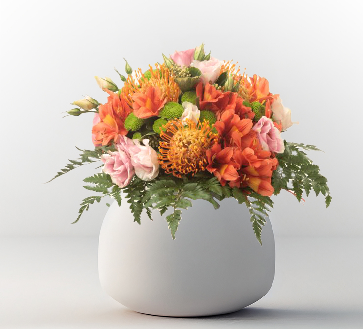 Un buchet vibrant și plin de farmec, alcătuit din alstroemeria portocalie, leucospermum exotic, lisianthus delicat roz, santini proaspăt și accente de verdeață luxuriantă. O alegere perfectă pentru a aduce bucurie și culoare în orice ocazie!